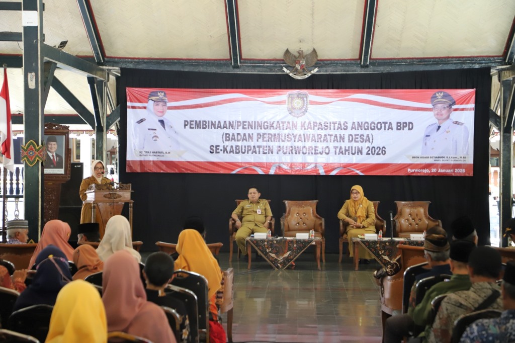PURWOREJO, epurworejo.com – Sebagai langkah persiapan masa transisi menjelang berakhirnya masa keanggotaan Badan Permusyawaratan Desa (BPD) di Kabupaten Purworejo masa keanggotaan tahun 2018-2026, Pemerintah Kabupaten Purworejo melalui Dinas Pemberdayaan Perempuan dan Perlindungan Anak serta Pemberdayaan Masyarakat dan Desa (DPPPAPMD), menggelar Pembinaan Peningkatan Kapasitas Anggota BPD se-Kabupaten Purworejo, di Pendopo Kabupaten Purworejo, pada Selasa (20/1/2026).