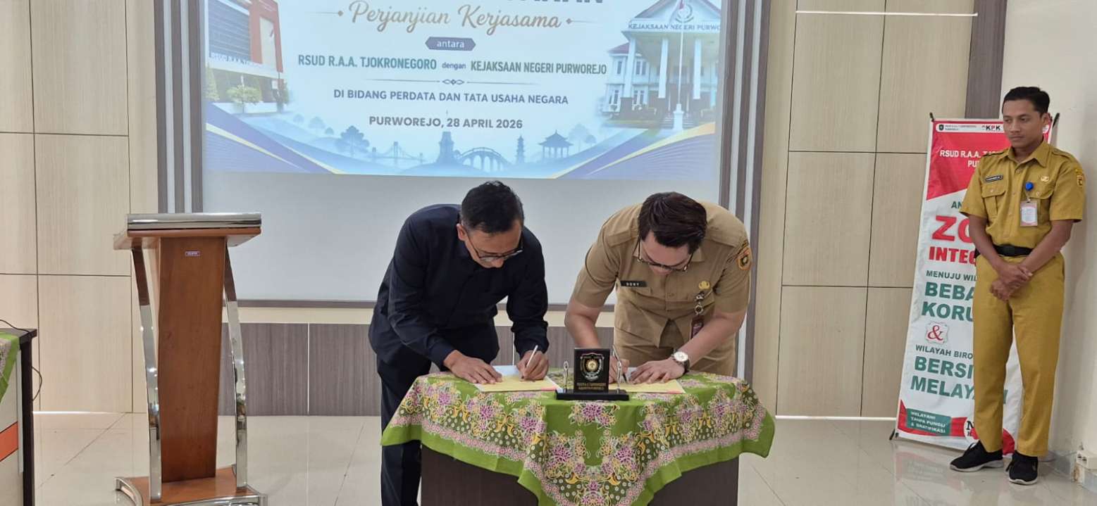 PURWOREJO, epurworejo.com – Tahun 2026 menjadi periode penting bagi RSUD RAA Tjokronegoro Purworejo dengan banyaknya agenda pengadaan dan kegiatan konstruksi yang akan dijalankan. Untuk memastikan seluruh proses berjalan sesuai aturan hukum, RSUD RAA Tjokronegoro kembali menjalin kerja sama dengan Kejaksaan Negeri Purworejo di bidang Perdata dan Tata Usaha Negara (TUN), Selasa (28/4/2026), di Aula RSUD RAA Tjokronegoro.